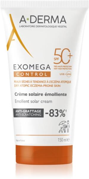 A-Derma Exomega Control Emollient Solar Cream, 150 ml, Gyerektestápolás unisex, Védje bőrét a napégéstől, az idő előtti öregedéstől és a napfény okozta egyéb károsodásoktól. A hatékony A-Derma Exomega Control Emollient Solar Cream termék ásványi UV-szűrőt tartalmaz, védőgátat hoz létre a bőrön, amely visszaveri az UV-sugarakat, és segít megelőzni nemcsak a leégést vagy a pigmentfoltok kialakulását, hanem a bőr rugalmasságának csökkenését, a kollagénvesztést és a bőr öregedésének egyéb jeleit is. Végül, de nem utolsósorban jelentősen csökkenti a bőrrák kockázatát. Tulajdonságok: UVA és UVB sugárzástól is védi a bőrt vízálló készítmény hidratáló hatású felkészíti a bőrt a napon való tartózkodásra védőgátat hoz létre, amely megvédi a bőrt a káros külső hatásoktól Összetétel: parfümmentes bőrgyógyászatilag tesztelt SPF – védelmet nyújt a káros UV-sugarak ellen Használata: Vigye fel a tiszta arcára és nyakára, majd körkörös mozdulatokkal masszírozza be a bőrbe. Hagyja felszívódni.