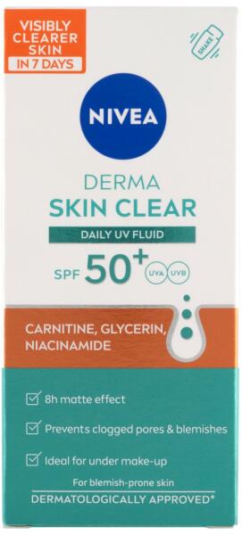 Nivea® derma skin clear uv fluid ff 50+ karnitinnel, glicerinnel és niacinamiddal kifejezetten a problémás, pattanásra hajlamos bőrre kifejlesztve. Ideális smink alá is, matt hatást biztosít akár 8 órára. Ultrakönnyű összetétel: nem hagy zsíros érzetet és fehér nyomot, nem komedogén, azonnal beszívódik.