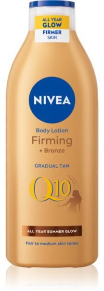Nivea Q10 Firming + Bronze, 400 ml, Testápoló tej nőknek, A rendszeres tisztítás mellett nemcsak az arcbőr, hanem a test bőre is megérdemli az ápolást a kiszáradás elkerülése érdekében. A hatékony Nivea Q10 Firming + Bronze testápoló biztosítja a megfelelő hidratáltságot, táplálja a bőrt és segít megőrizni a szükséges nedvességet. Puhává, bársonyossá teszi a bőrt, és védelmet nyújt a kiszáradás ellen, amely a bőr húzódásával, kellemetlen érzéssel és a kiszáradt bőr hámlásával jár. Tulajdonságok: mélyrehatóan hidratálja a bőrt észrevehetően erősíti bőr természetes napbarnított hatást biztosít a bőrnek Használata: Vigyen fel megfelelő mennyiségű készítményt a teljes testfelületre. Kenje szét alaposan és egyenletesen. Alkalmazása után alaposan mossa meg a kezét.