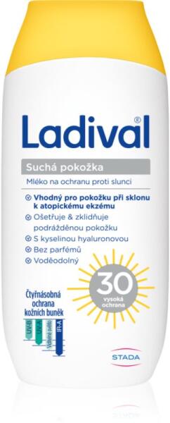 Ladival Dry Skin, 200 ml, Napozás előtti készítmények nőknek, Védje bőrét a napégéstől, az idő előtti öregedéstől és a napfény okozta egyéb károsodásoktól. A rendkívüli Ladival Dry Skin fényvédő hatékony védőpajzsot képez az UV-sugarakkal szemben, segít megelőzni nemcsak a leégést vagy a pigmentfoltokat, hanem a bőr rugalmasságának csökkenését, a kollagénvesztést és az öregedés egyéb jeleit is. Végül, de nem utolsósorban jelentősen csökkenti a bőrrák kockázatát. Tulajdonságok: UVA és UVB sugárzástól is védi a bőrt szükséges mértékben hidratálja a bőrt vízálló készítmény nem vált ki zsíros érzést Összetétel: hialuronsav –⁠⁠⁠⁠⁠⁠ nagy mennyiségű vizet köt meg és intenzíven hidratál parfümmentes Használata: Napon tartózkodás előtt vigye fel megfelelő mennyiségben a teljes testfelületre.